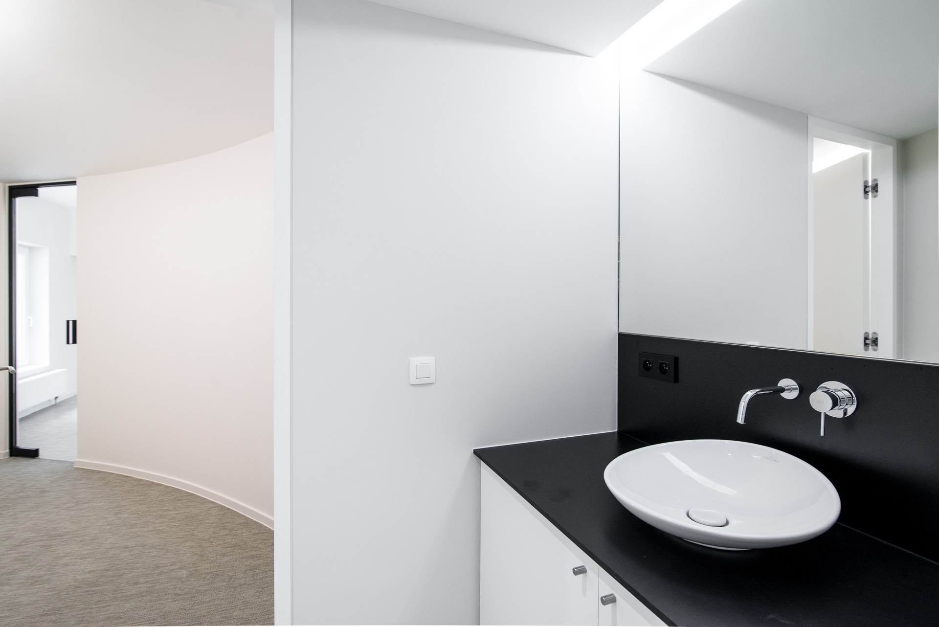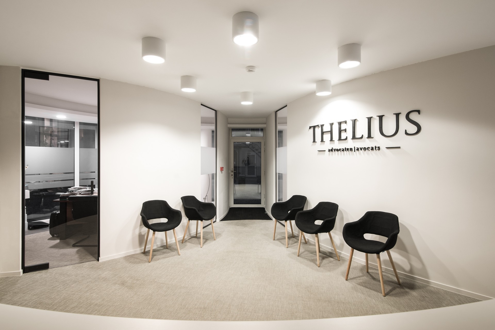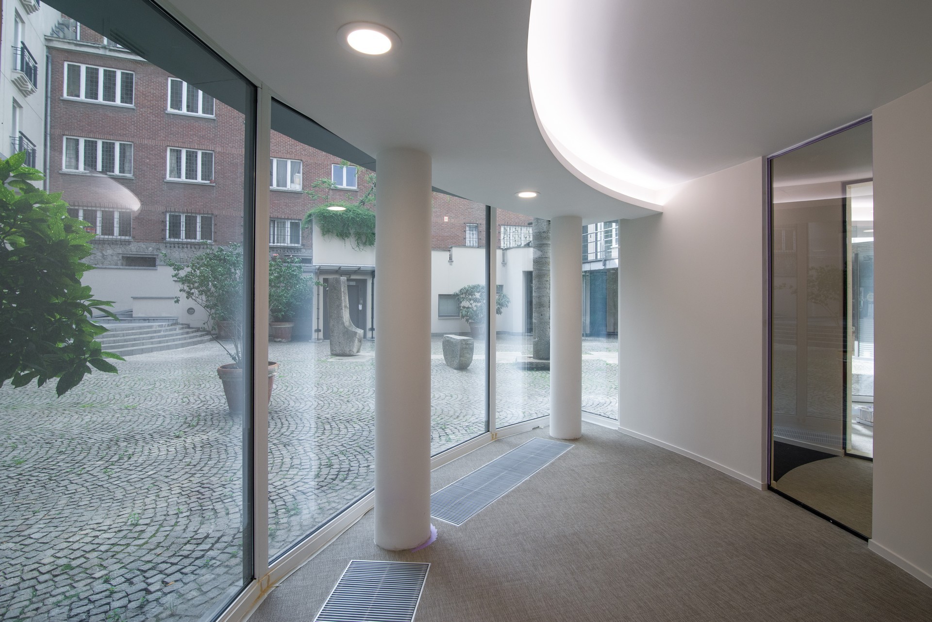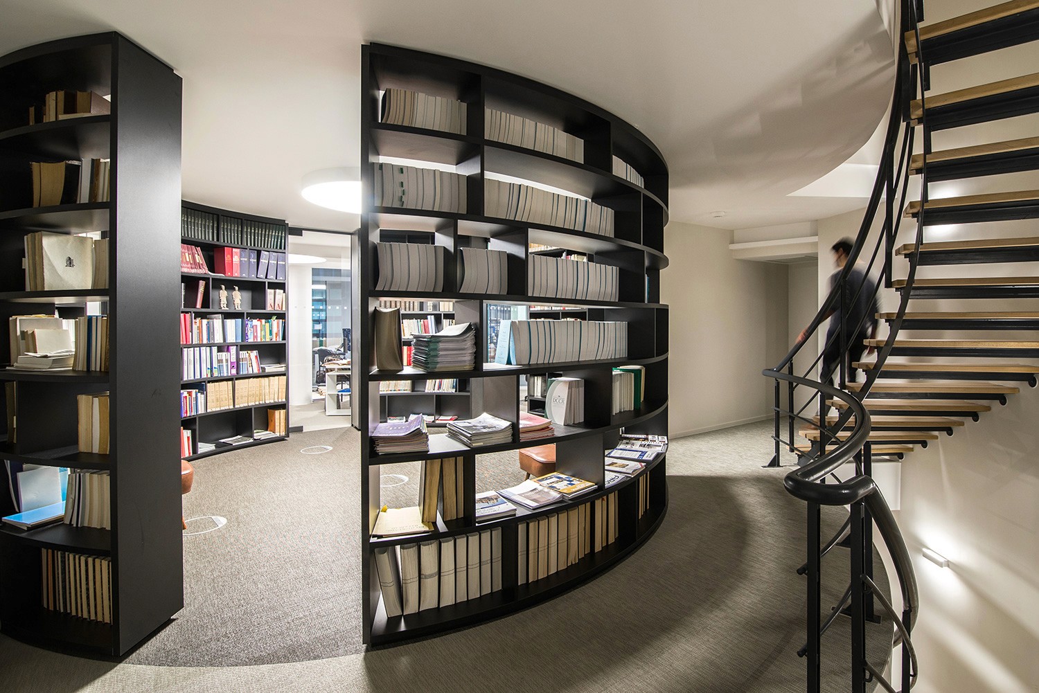 En collaboration avec Karim Hamza et maa_architecture studio, nous avons réalisé la rénovation d'un bâtiment en forme de rotonde à Bruxelles pour mettre en liaison l'espace commercial du rez-de-chaussée avec les plateaux de bureaux du 1er, 2ème et 3ème étage. En tant qu'entreprise générale, nos travaux ont compris le gros œuvre, l'exécution d'un escalier en métal et bois, les travaux de cloisonnement, les plafonds, les sols, la création des espaces kitchenette et sanitaires, le mobilier sur mesure, les portes en verre, l'électricité, l'éclairage et les finitions, ainsi que l'aménagement de la terrasse extérieure.